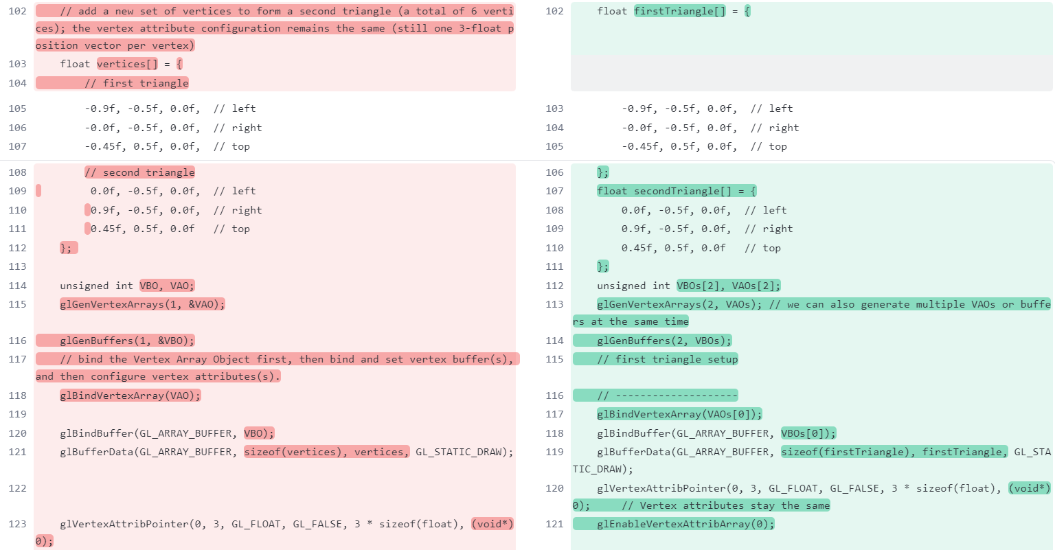 exercise2에서는 두개로 분리하여 VBO와 VAO역시 배열형으로 선언한 후 각종 generate와 bind처리를 두번씩하였다.