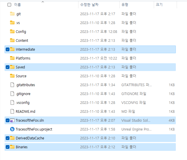 1. 엔진과 비쥬얼 스튜디오를 전부 다 끄고 프로젝트 폴더에서 아래 체크된 폴더들을 제거한다.